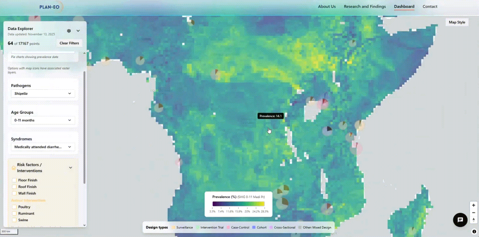 Colston gives a practical example: a funder considering where to trial a new Campylobacter vaccine. By exploring observed or predicted prevalence across candidate locations, decision-makers can identify where transmission is sufficiently high to detect an effect. Even in regions with little or no direct evidence, Plan-EO’s prediction models can provide a starting point.